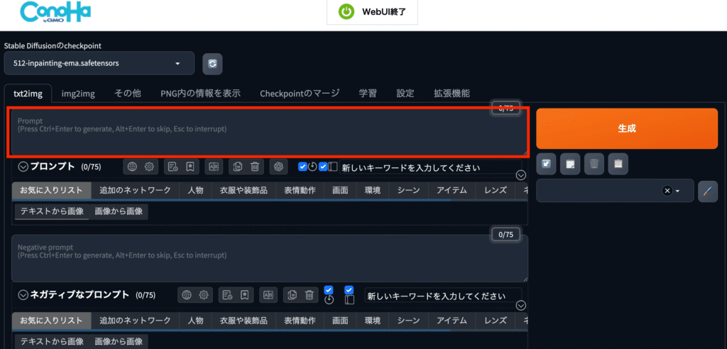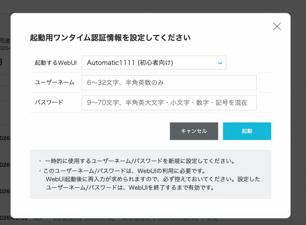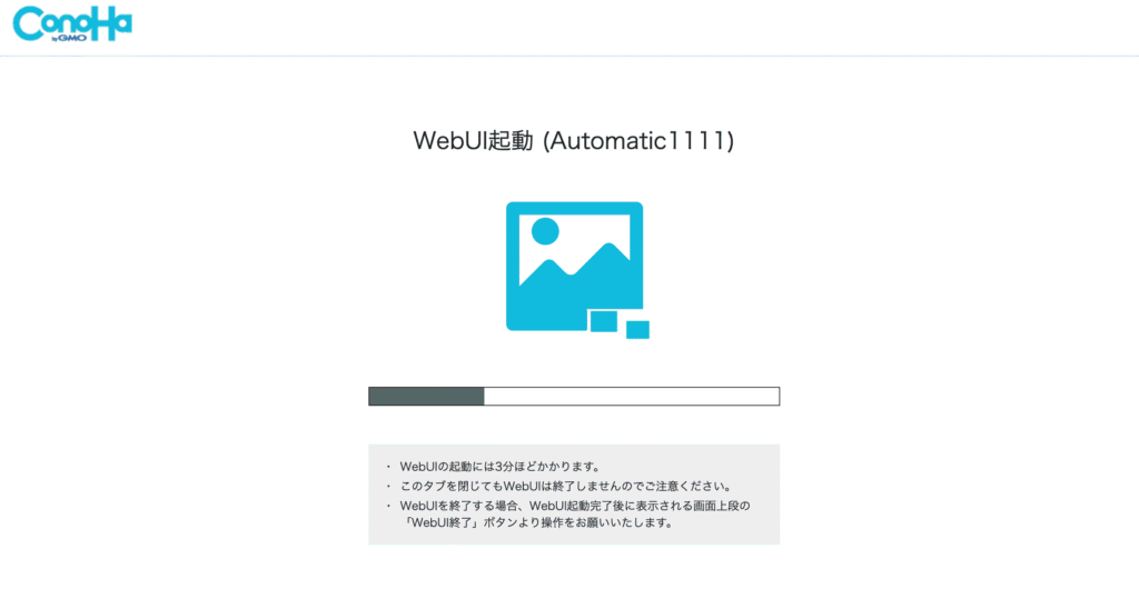 起動ボタンをクリックできましたら、WebUI起動が開始されます。