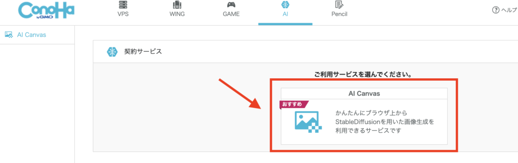 ConohaWingの登録が完了しましたら、以下画面のコントロールパネルから「AI Canvas」を選択します。
