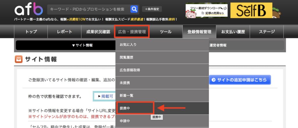 もしもアフィリエイトにログインできましたら、「プロモーション検索 → 提携中」リンクをクリックします。
