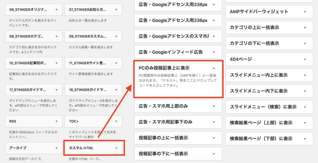 ウィジェットの画面になりましたら、「カスタムHTML」を押したまま「PCのみ投稿記事上に表示」まで持っていきます。